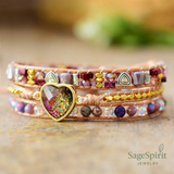 Let intuition and connection guide you with the Kindred Heart Wrap Bracelet. This 3-strand, handcrafted piece features a purple heart-shaped centerpiece and natural stones like amethyst-toned crystal, opal, and turquoise. Designed to symbolize wisdom, compassion, and soulful bonds, it's a beautiful reminder to stay open-hearted and spiritually aligned.